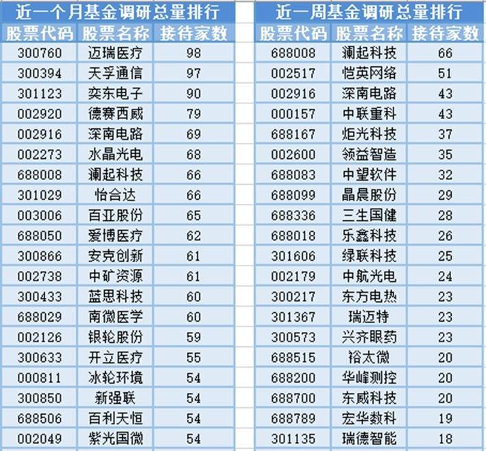 将时间周期缩短到最近一周(9月1日-9月8日)来看,基金调研数量第一的公司澜起科技,属于集成电路行业行业,主营业务为国际领先的数据处理及互连芯片设计公司。共被66家基金机构调研,然后被调研数量较多的股票是恺英网络、深南电路和中联重科,分别接受51家、43家和43家基金机构的调研。