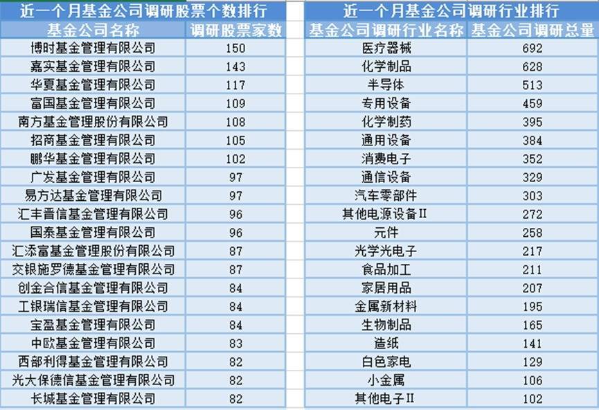 近一个月(8月9日-9月8日),博时基金参与公司调研的数量最多,共调研150家上市公司,然后调研较为活跃的还有嘉实基金、华夏基金和富国基金,分别调研143家、117家、109家上市公司;从调研行业上来看,基金公司对医疗器械行业的上市公司调研次数最多,共有692次,其次是化学制品行业,基金公司调研了628次。