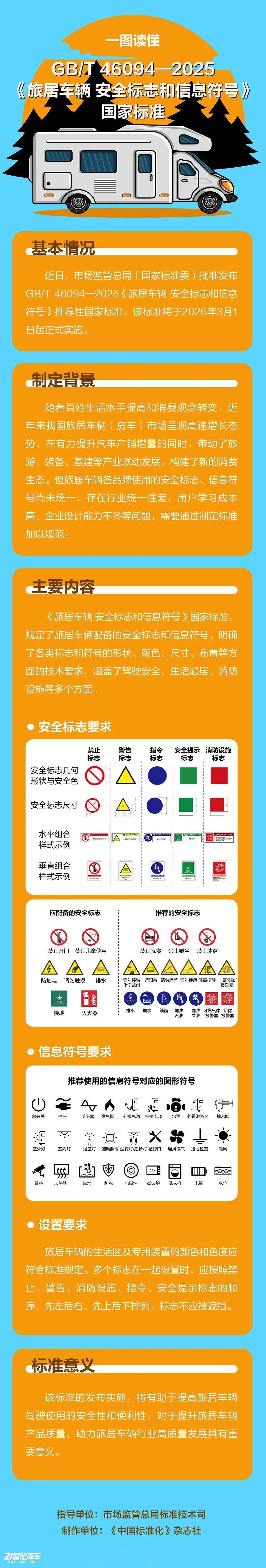 近日,国家市场监管总局(国家标准委)正式批准发布《旅居车辆 安全标志和信息符号》(GB/T 46094—2025)推荐性国家标准。该标准将于2026年3月1日起实施,旨在通过统一、规范的安全标志和信息符号,提升旅居车辆(房车)的使用安全性与便利性,为行业高质量发展提供技术支撑。