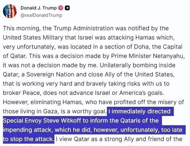 更耐人寻味的是以色列处理这次行动的方式。以军方消息人士透露,他们在行动前仅仅"提前一刻"通知了美国,这让白宫方面相当难堪。特朗普在袭击发生10分钟后才急忙致电卡塔尔埃米尔,忙不迭地撇清关系,声称这是内塔尼亚胡的"单方面决定"。